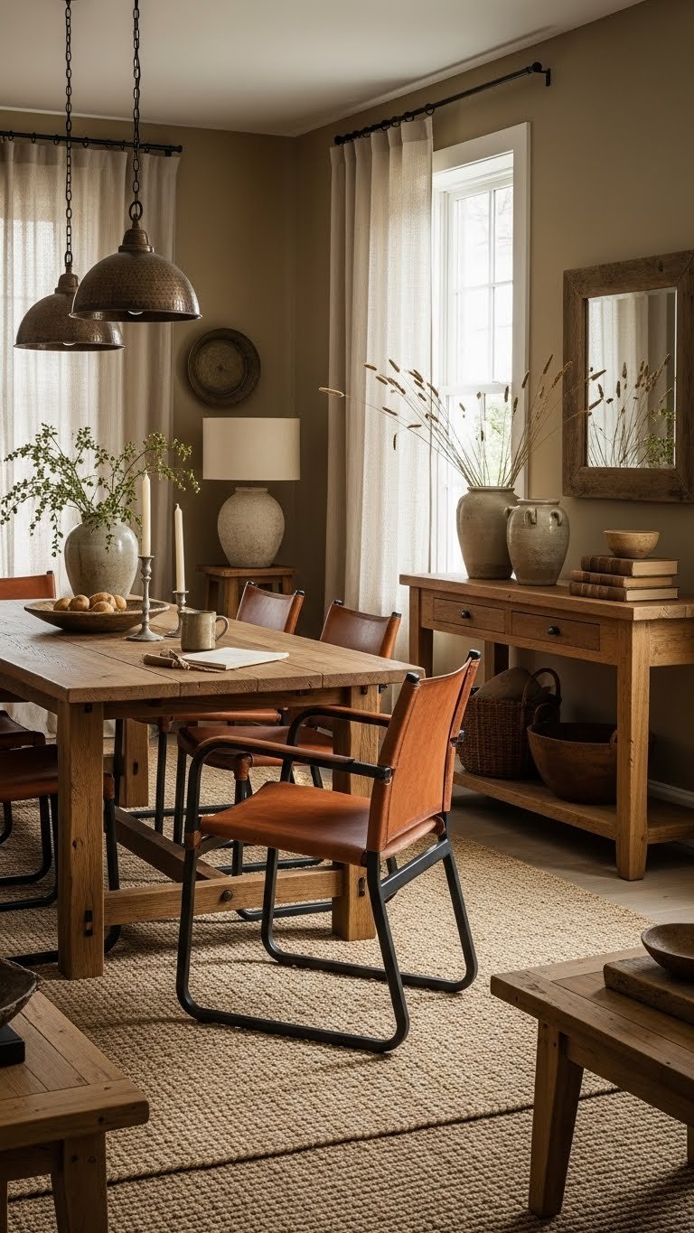 Choose reclaimed oak for tables, vegetable tanned leather for seating, linen for drapes, and low-VOC finishes so your space feels free, honest, and quietly enduring.