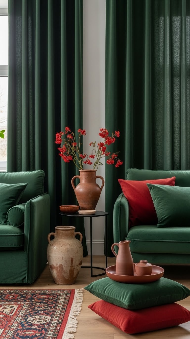 When you layer velvety forest greens with clay reds, rooms instantly feel softer and more grounded, as the deep coolness of green calms while the warm red adds earthy warmth and approachability.