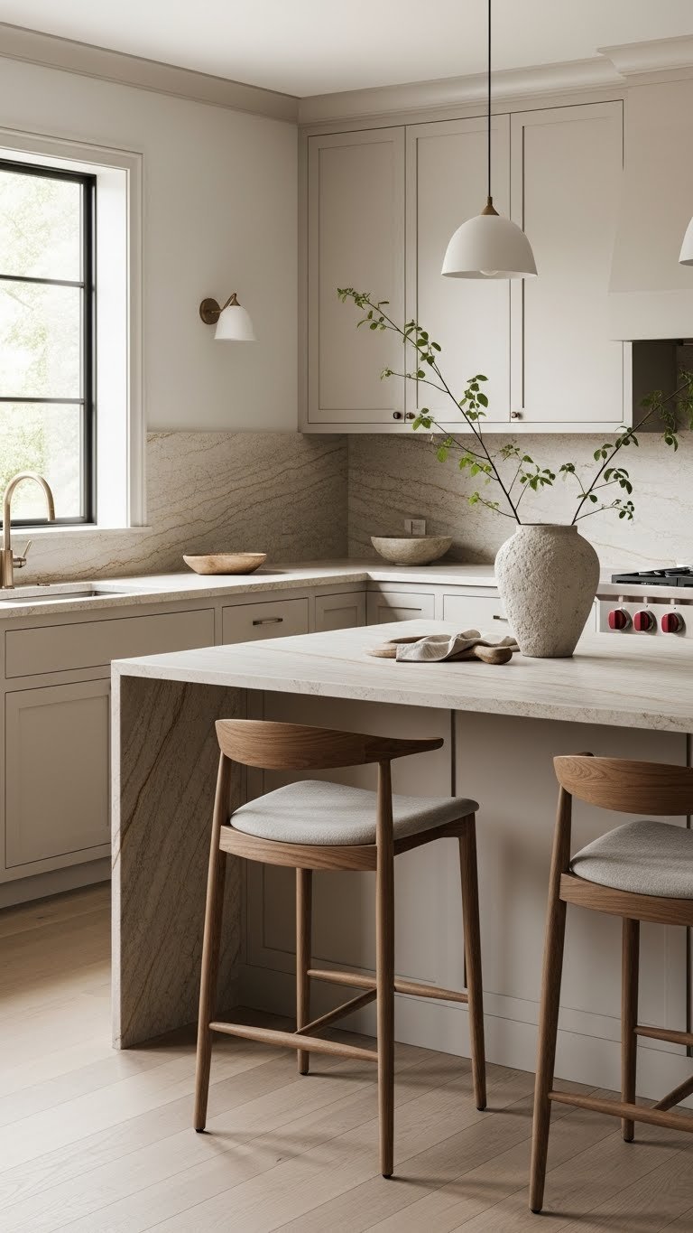 Choose honed countertops with subtle veining and matte finishes to ground spaces while letting furnishings breathe. You’ll appreciate how warm undertones lend calm depth, resisting trends and allowing freedom in styling.