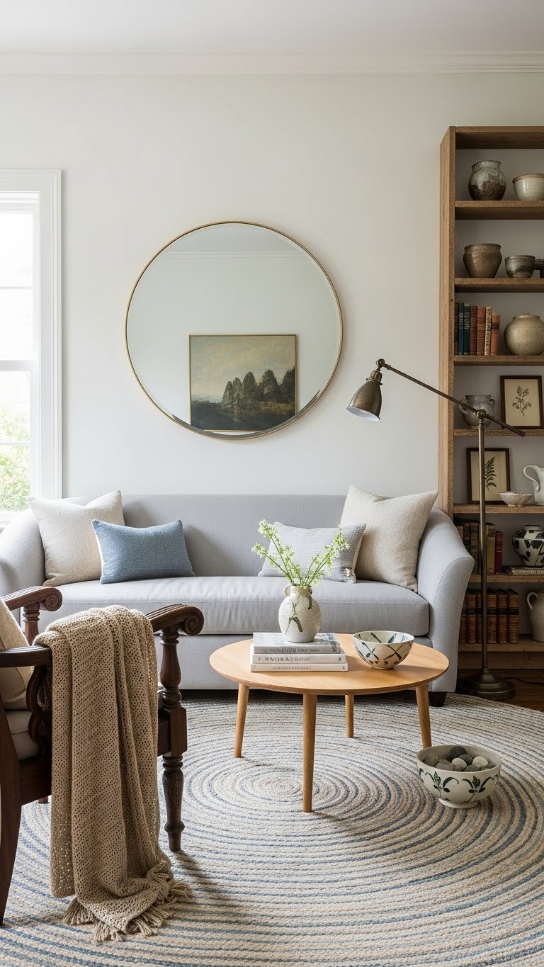 After softening edges with a round mirror and circular rug, think about the objects you let stay in the room: choose furniture and decor that earn their place through function, quality, and quiet beauty.