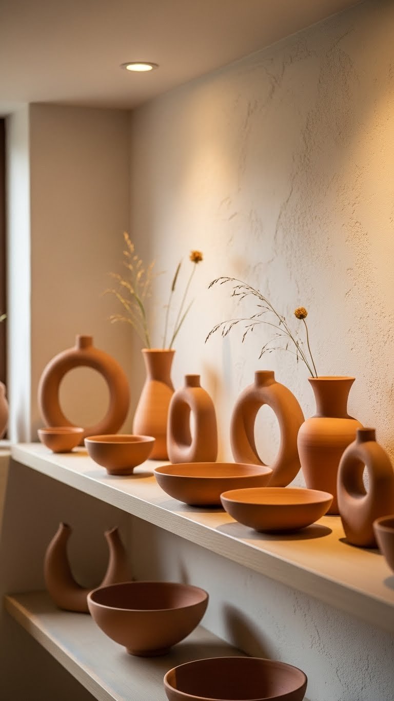 Bring in clay and terracotta accents to warm up and ground your space with subtle, earthy texture. You’ll choose matte terracotta vases, shallow bowls, and sculpted clay pieces that feel handmade and free. Place them sparingly on shelves, consoles, or a mantel to anchor light palettes without clutter.