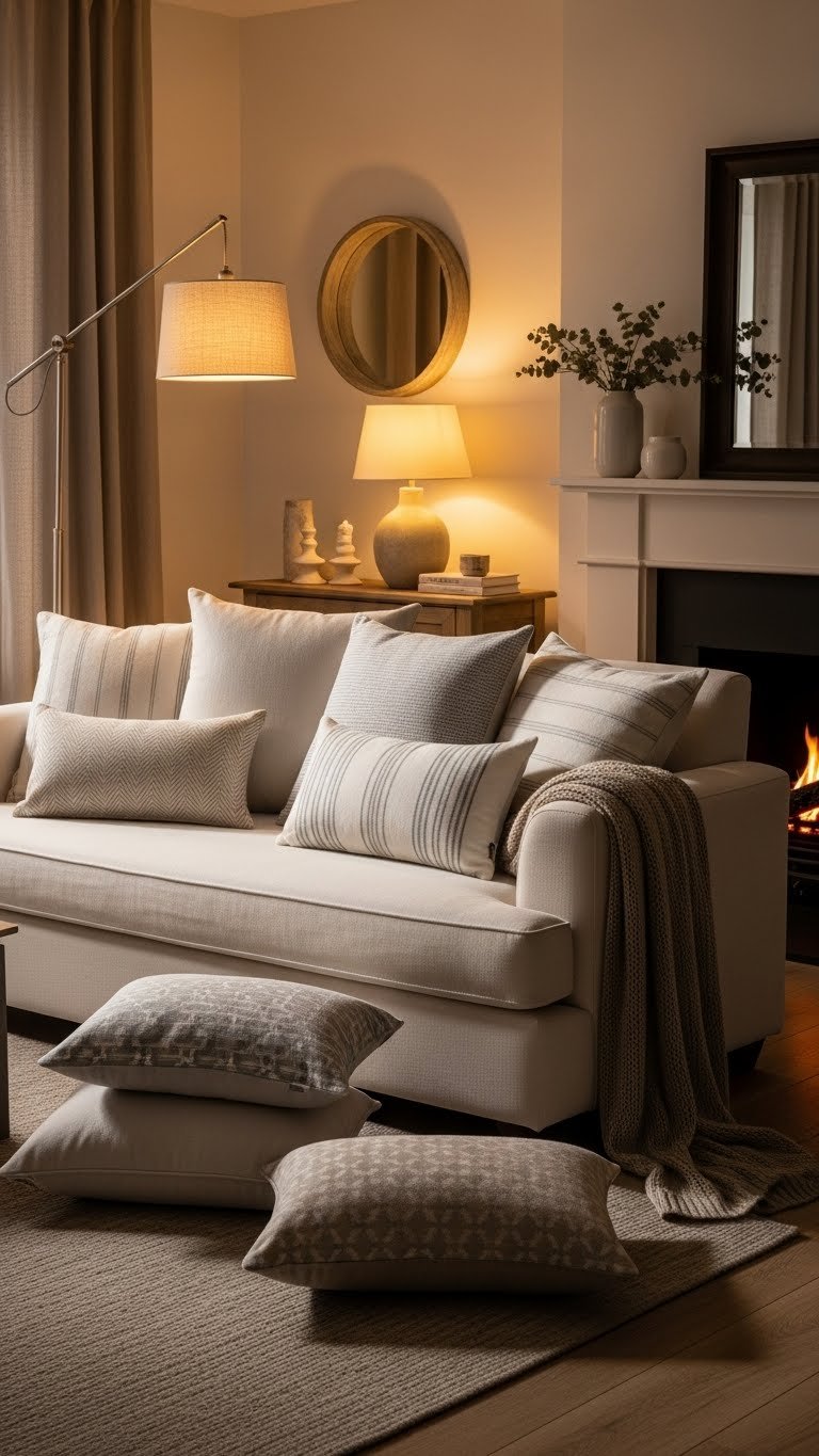 Often you’ll find that a few well-chosen pillows and a soft throw instantly make a room feel lived-in and inviting. You arrange layered cushions in neutral textures and muted patterns, mixing sizes for comfort and ease.