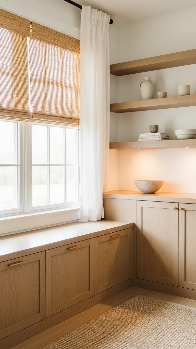 After framing your view with airy linen panels and bamboo shades, keep that same serene feeling by choosing storage that’s pared-back and purposeful. You’ll favor clean-lined cabinets, floating shelves, and pieces with hidden compartments to reduce visual clutter.