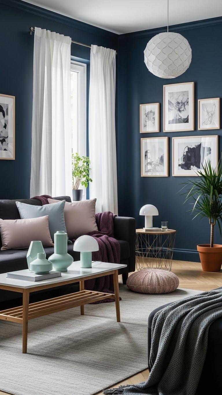 When you anchor a room in deep, moody hues, introduce soft pastels to lift the space and prevent it from feeling heavy. Pair deep navy walls with powder blush pillows, add charcoal plum throws for depth, and place pale mint accessories to freshen corners.