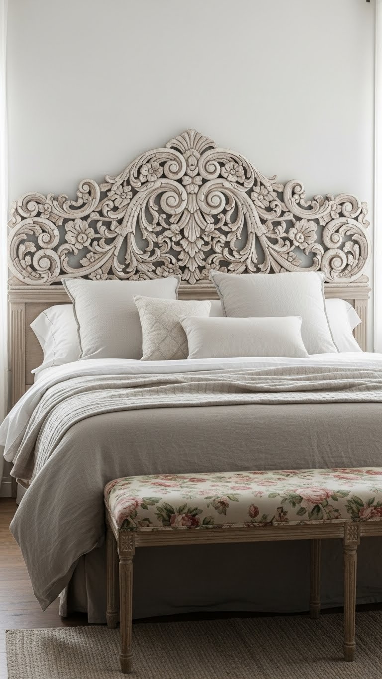 A vintage carved headboard instantly anchors your bedroom with sculpted history—think hand-chiseled florals or baroque scrolls that read like wearable art behind the bed.