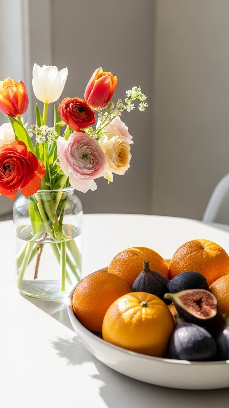 Place a simple glass vase or a low ceramic bowl where sunlight skims the table, then assemble a small bouquet of seasonal blooms—tulips in spring, ranunculus in late winter, or fragrant garden roses in summer—paired with a shallow fruit bowl of ripe citrus or figs for color and texture contrast.