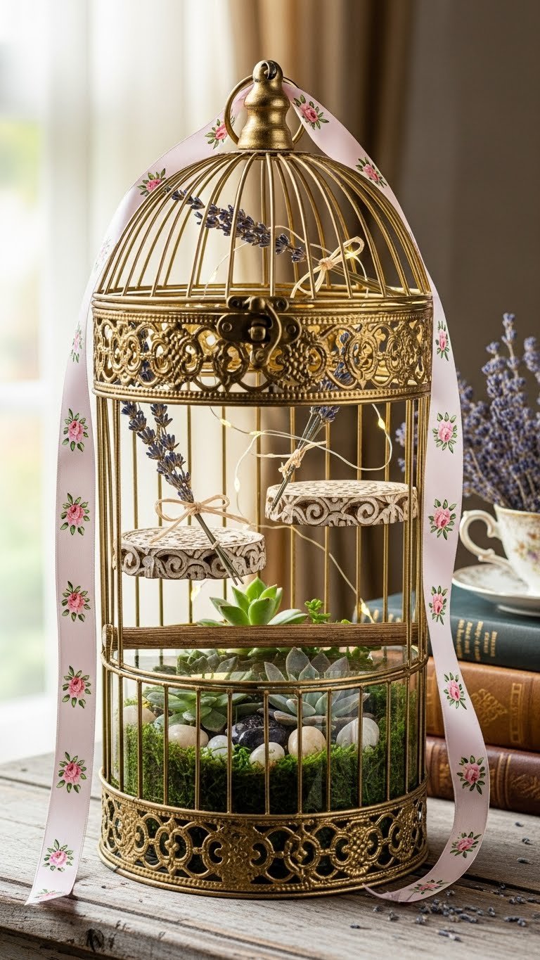 If you want to add a touch of whimsy that reads both vintage and modern, style a gilded birdcage as a layered accent piece that feels collected, not contrived.