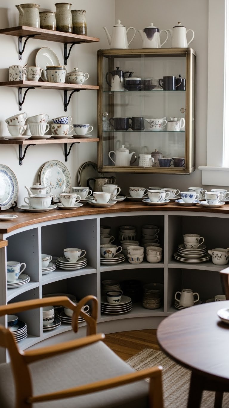 Curved furniture invites you to slow down, and displaying collected teacups and pottery lets you turn that pause into a small, beautiful ritual. You curate a china display on open shelves or a glass cabinet, mixing glaze tones and heights.