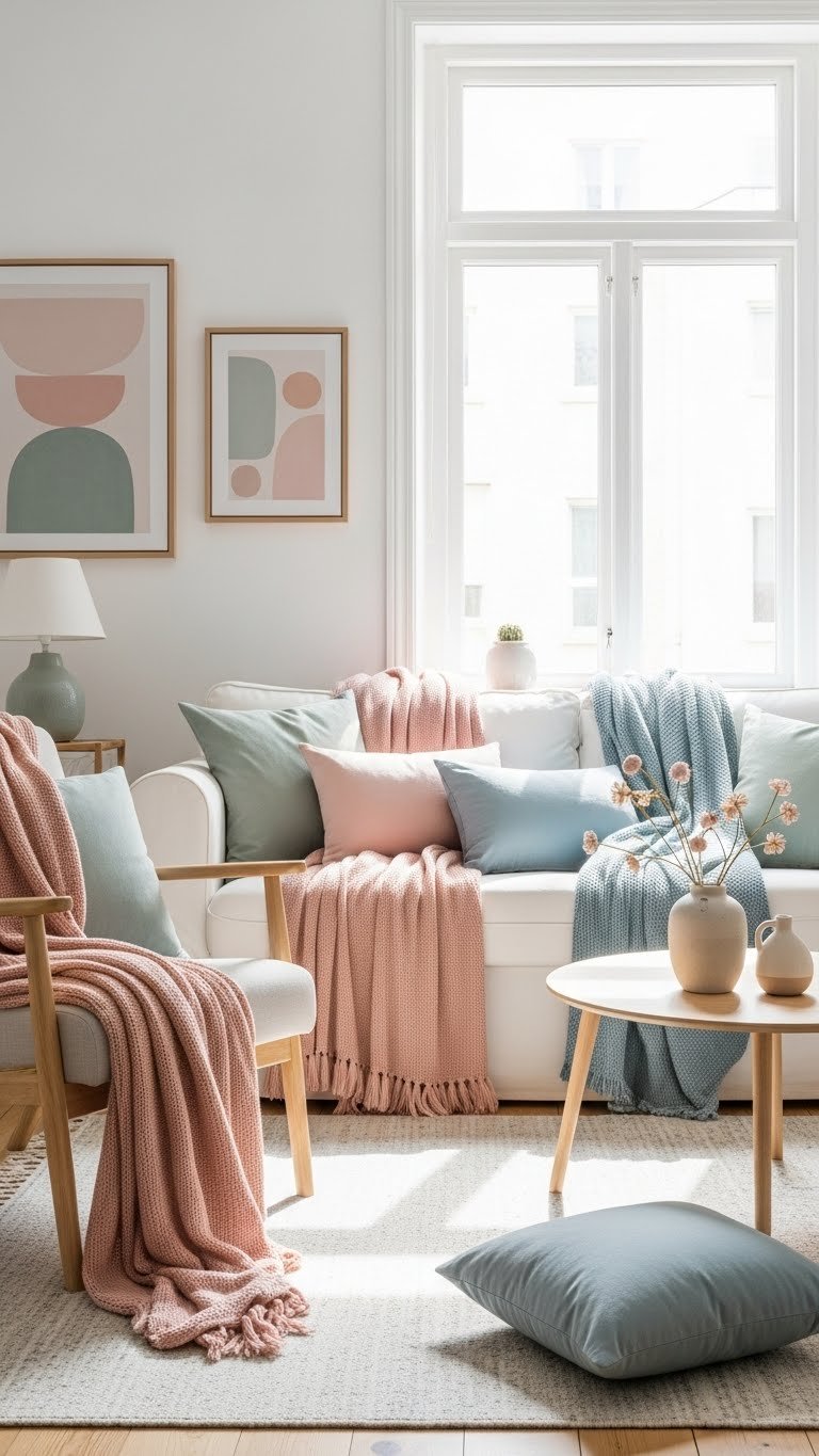A soft pastel palette can instantly warm a living room without overpowering it. You’ll choose pastel textiles for throws and cushions, pairing blush, sage, and powder blue to create breathable calm.