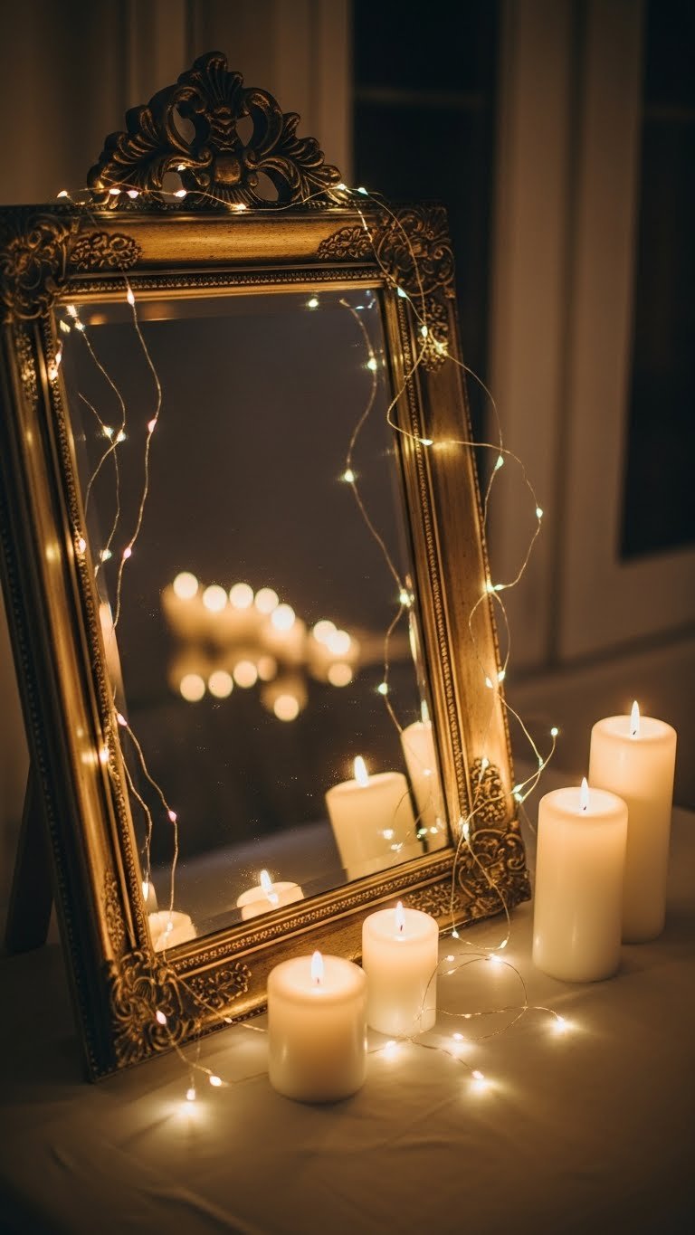 After arranging candle clusters for a soft evening glow, you can echo that warmth by framing mirrors with delicate twinkle light garlands. Let a mirror garland trace vintage frames, bulb draping soft lines that catch fairy reflections.