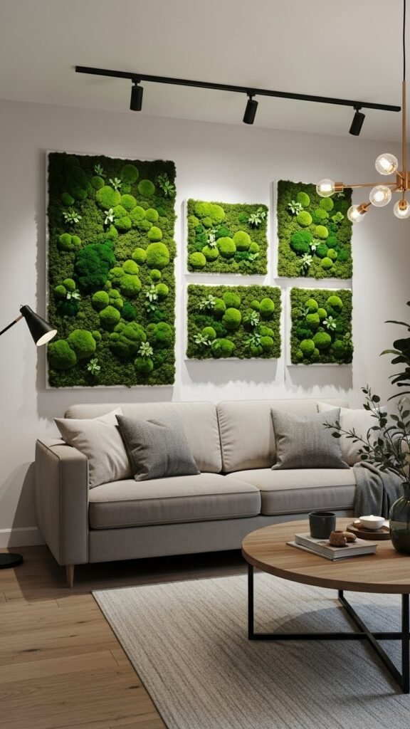 Looking to refresh your living room this spring? You’ll create a fresh botanical focal wall that feels liberating: combine sculptural moss art panels with adjustable botanical lighting to highlight texture and depth.