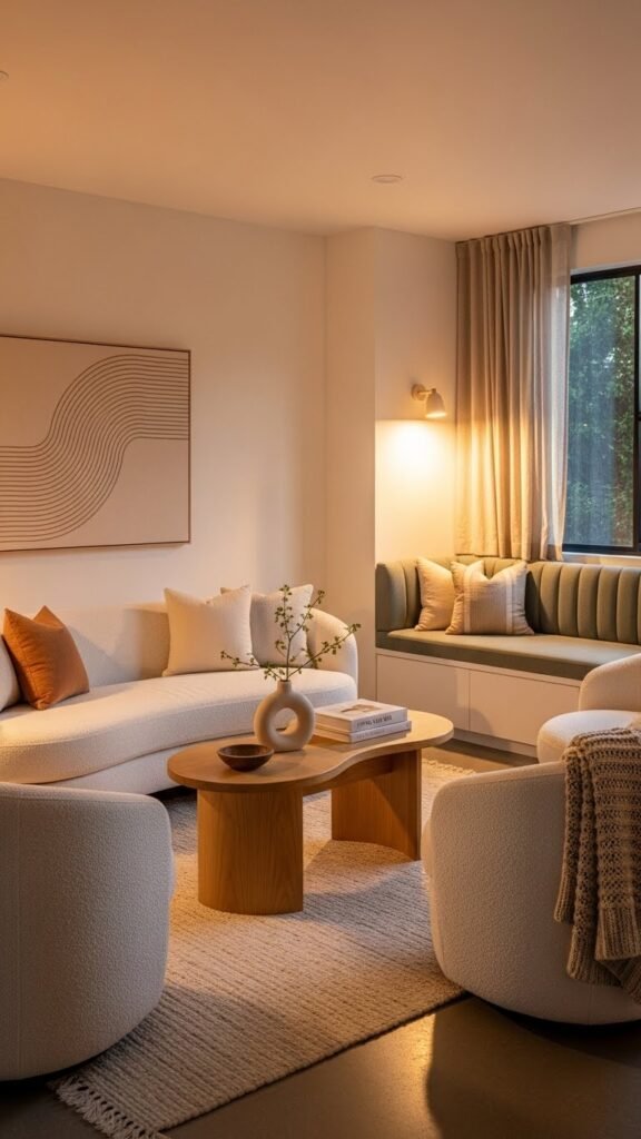 Often the gentlest curves make the boldest statements, so introduce rounded sofas, barrel chairs, and crescent coffee tables to soften corners and invite lingering conversations.