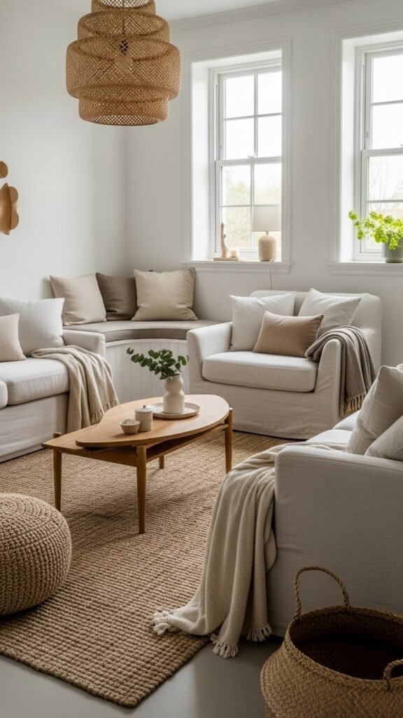 With a base of linen slipcovers and jute rugs, layer in cotton throws, hemp poufs, and wool pillows to add depth and tactile contrast that feels effortlessly curated.