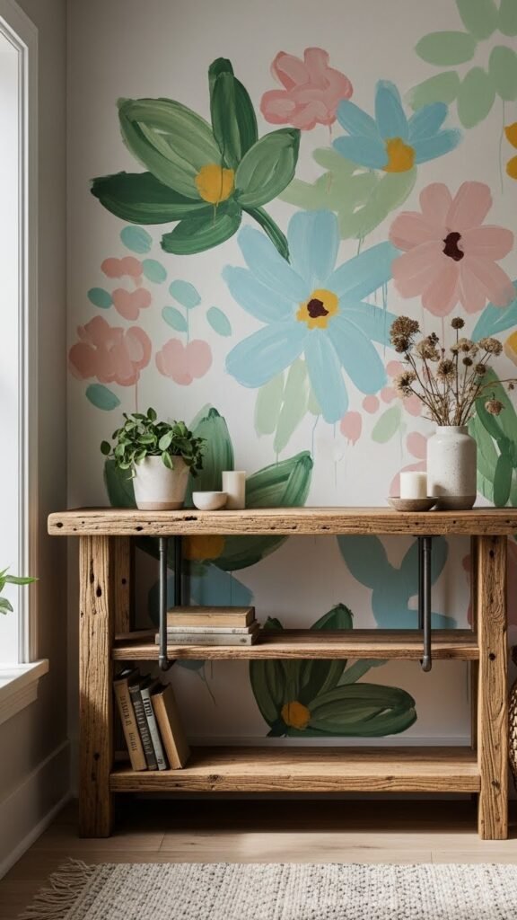 After the mural sets an expressive backdrop, anchor the room with a reclaimed wood statement console that grounds the space and adds tactile warmth.