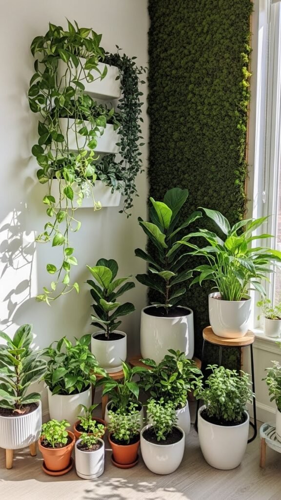 You’ll pair vertical planters for compact, upward drama with a tactile moss wall to soften lines.