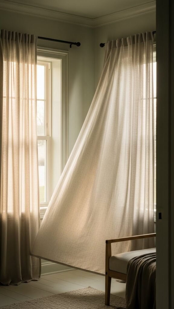 Pairing a sage green wall with lightweight linen drapery keeps the room feeling airy and intentional—soft, sheer panels let in spring light while adding texture against smooth paint.