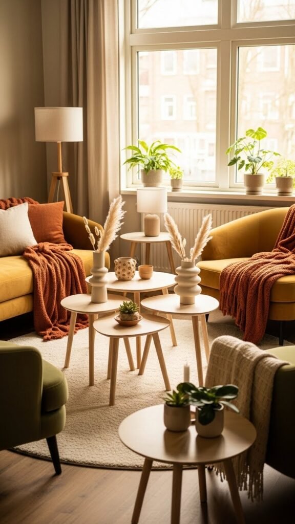 With its soft geometry, a circular rug instantly softens corners and invites conversation, while rounded tables echo that flow to keep the room feeling cohesive and unforced.