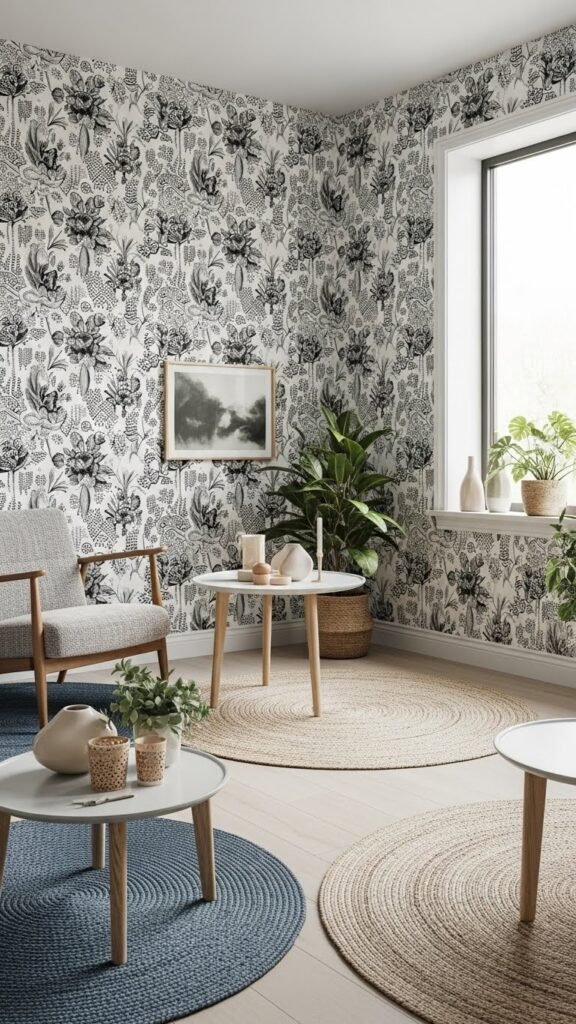If your rounded rugs and tables bring soft movement to the room, botanical print wallpaper adds a fresh, living layer that amplifies that organic feel.