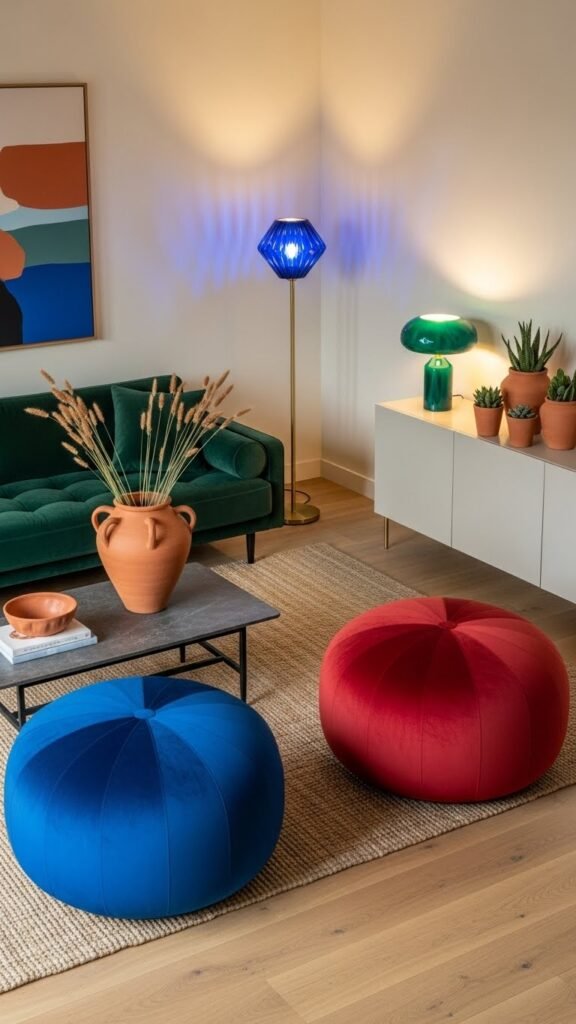 Pair those sunbaked terracotta pieces with soft velvet seating in jewel tones to lift the room without stealing its calm. Choose a low-profile sofa or velvet pouf in emerald or sapphire to invite lounging and bold ease.