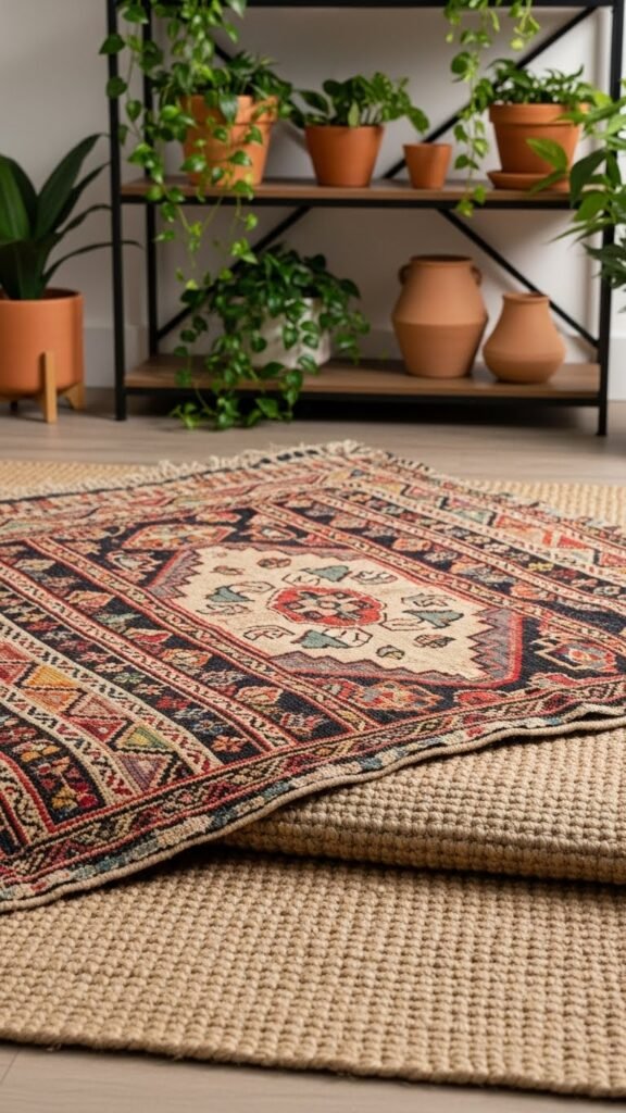 Mix a neutral jute base with a colorful vintage kilim atop for personality and texture. Layering gives warmth even if you keep heated flooring low, and it lets you switch moods freely—bold pattern, soft neutrals, or boho chic without commitment.