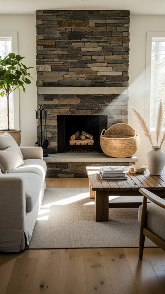 You’ll embrace layered stone textures, offset by airy furnishings and curated hearth accessories—think minimal logs, matte tools, and a woven basket.