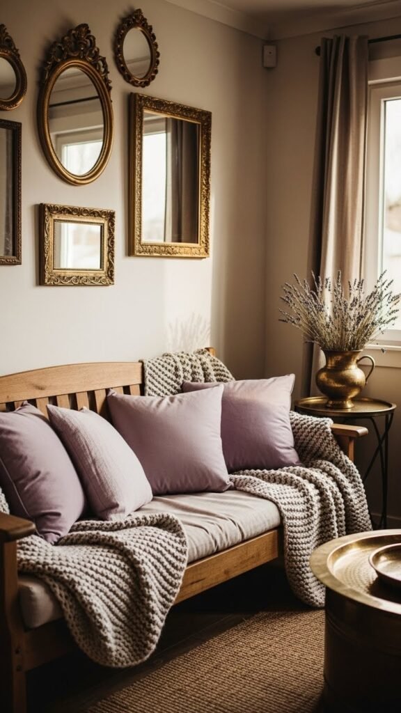 You’ll layer lavender accents on pillows and throws, choose gold trim on mirrors and frames, add botanical scenting with dried sprigs, and anchor details in vintage brass for liberated, polished contrast.