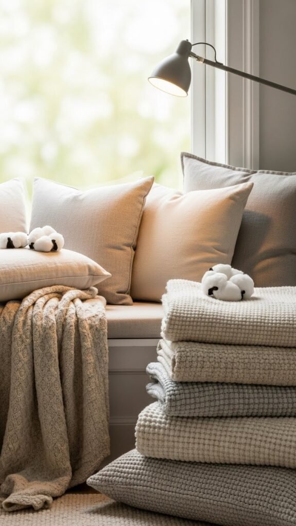 You’ll mix organic cotton cushions, hemp throws, and silk blends for subtle sheen, placing a seagrass basket for storage and texture.
