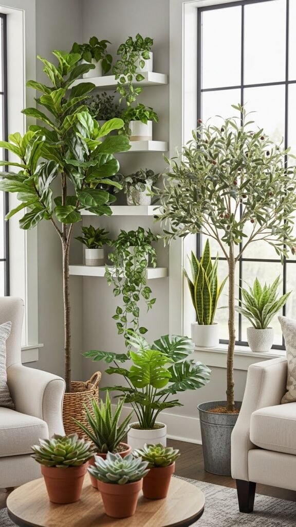 You’ll use silk succulents for small nooks and a faux fiddleleaf for sculptural impact, arranging in layers for effortless, liberated style.