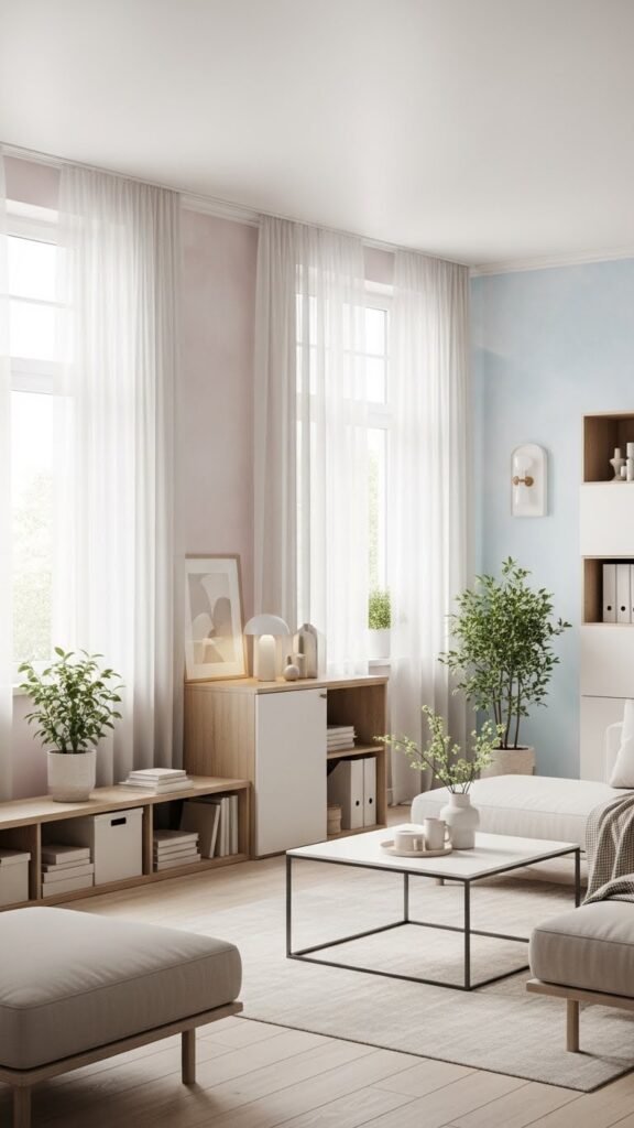 You’ll lean into muted watercolor walls and powder blue accents to expand light and space. Choose simple furnishings, translucent fabrics, and streamlined storage so rooms feel free, intentional, and easy to rearrange as your mood or season shifts.