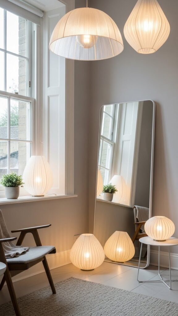 You’ll enjoy translucent silhouettes that feel airy and free, while keeping functionality—adjustable placement, warm bulbs, and simple forms—so your small space stays bright, stylish, and effortlessly liberated.