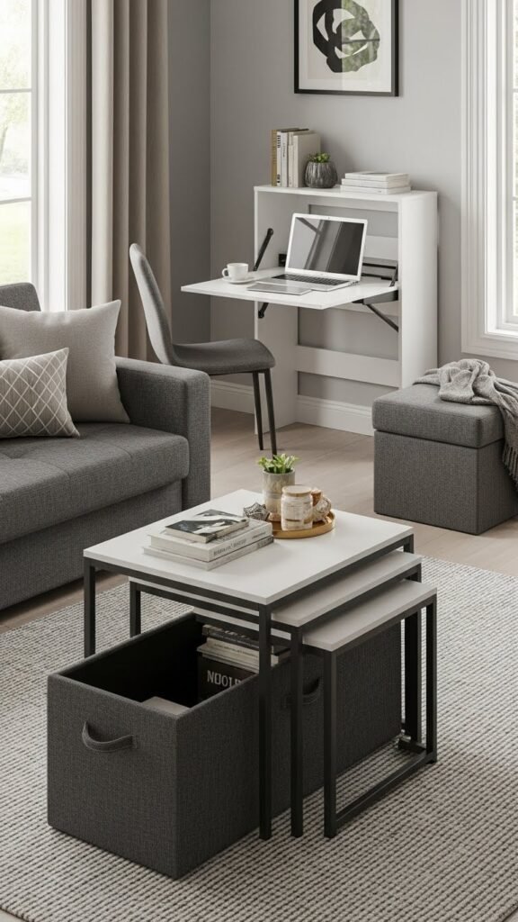 When space is tight, pick pieces that do double duty so every item earns its place; a sleeper sofa, nesting tables, or an ottoman with storage gives you seating, surface, and hidden stowage without cluttering the room.