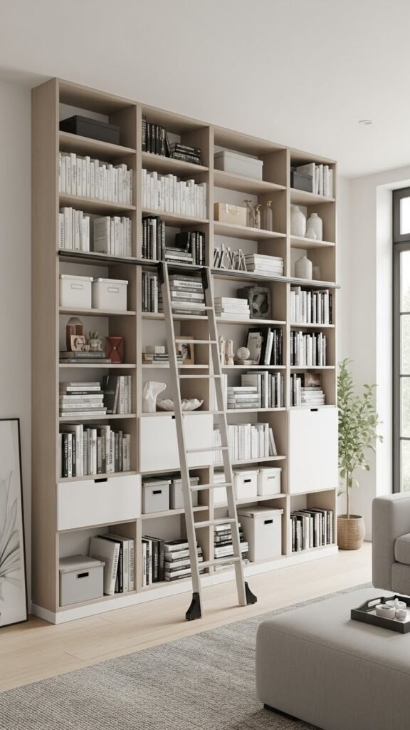 You’ll combine recessed shelving with freestanding units and vertical ladders for access, creating airy, liberated walls.