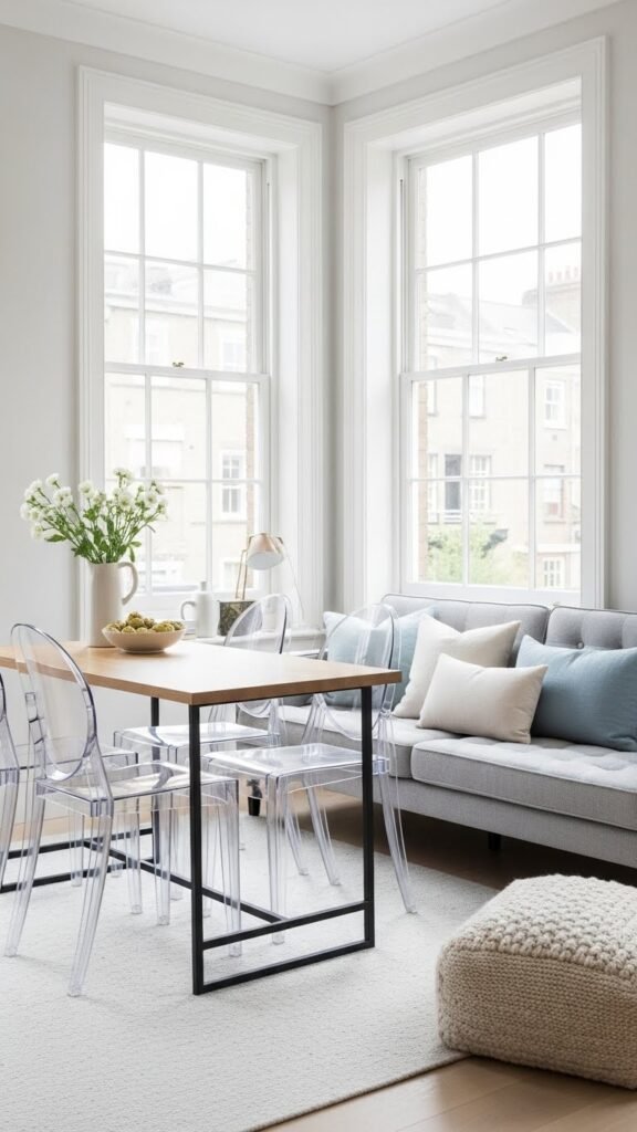 Lean into pieces that disappear visually: clear acrylic chairs, slim metal frames, and low-profile sofas keep sightlines open so the room feels larger without sacrificing seating. Choose clear acrylic or slim silhouettes to maintain airy flow, mix tactile cushions for comfort, and pick lightweight finishes so you can rearrange freely. These choices make small spaces feel open, modern, and unfettered.