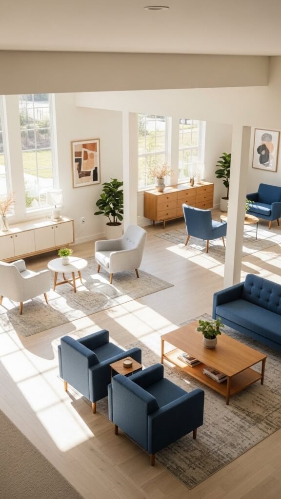 Use angled seating to suggest flow, create conversational pockets, and let sunlight travel.