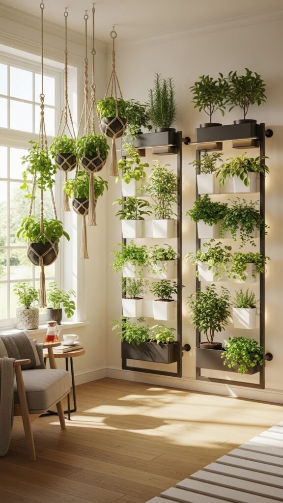 Bringing in hanging or vertical planters lets you maximize green without sacrificing floor space, so you keep clear pathways and an airy feel.