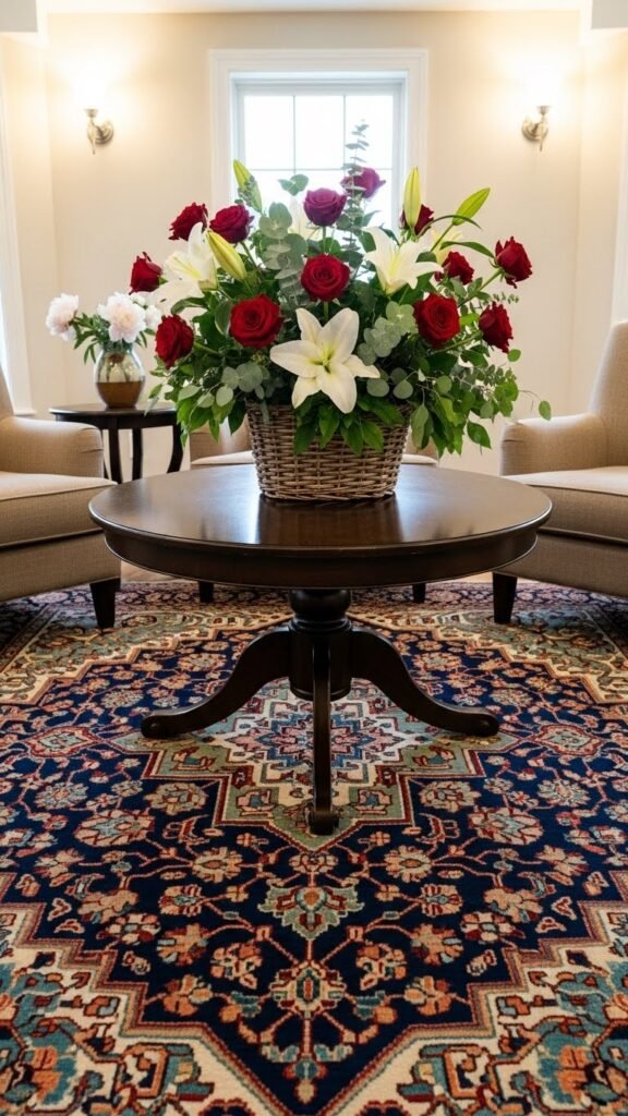 After you’ve arranged a tidy floral centerpiece, anchor the room with a single statement rug to give the small-scale vignette a grounded, cohesive feel. Choose bold motifs and mix scale subtly using layered patterns and simple rug layering techniques that respect space. You’ll create depth without clutter, letting one confident rug define flow, invite movement, and keep the apartment feeling open and free.