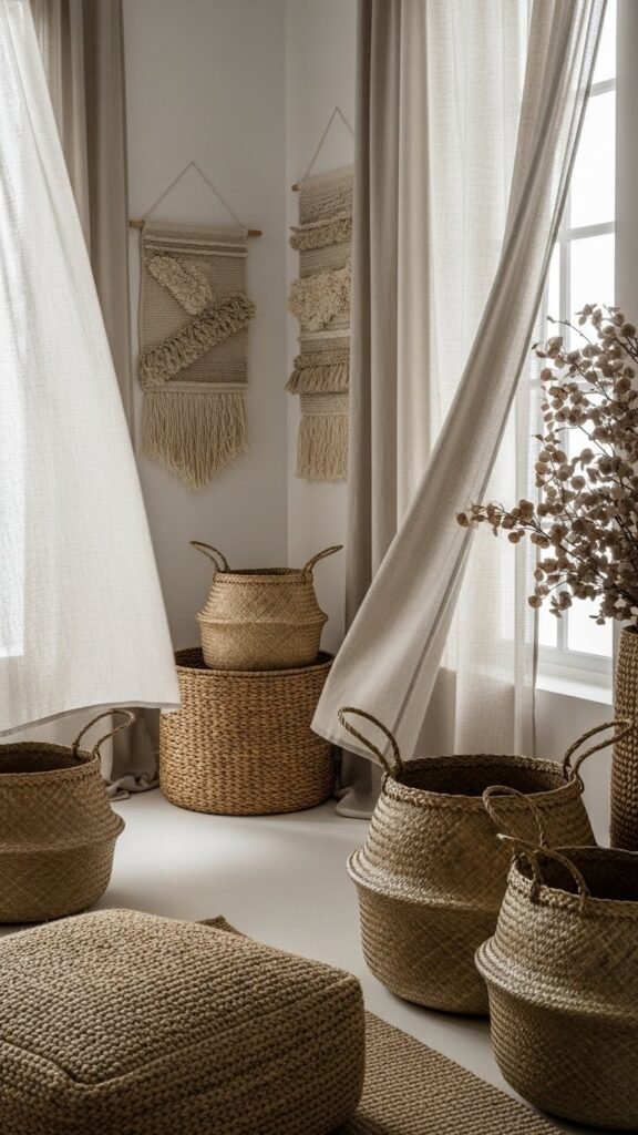 Choose neutral tones, varied weaves and tactile scales; tuck baskets for storage, hang linen to diffuse light, and let natural textures create a calm, airy atmosphere.