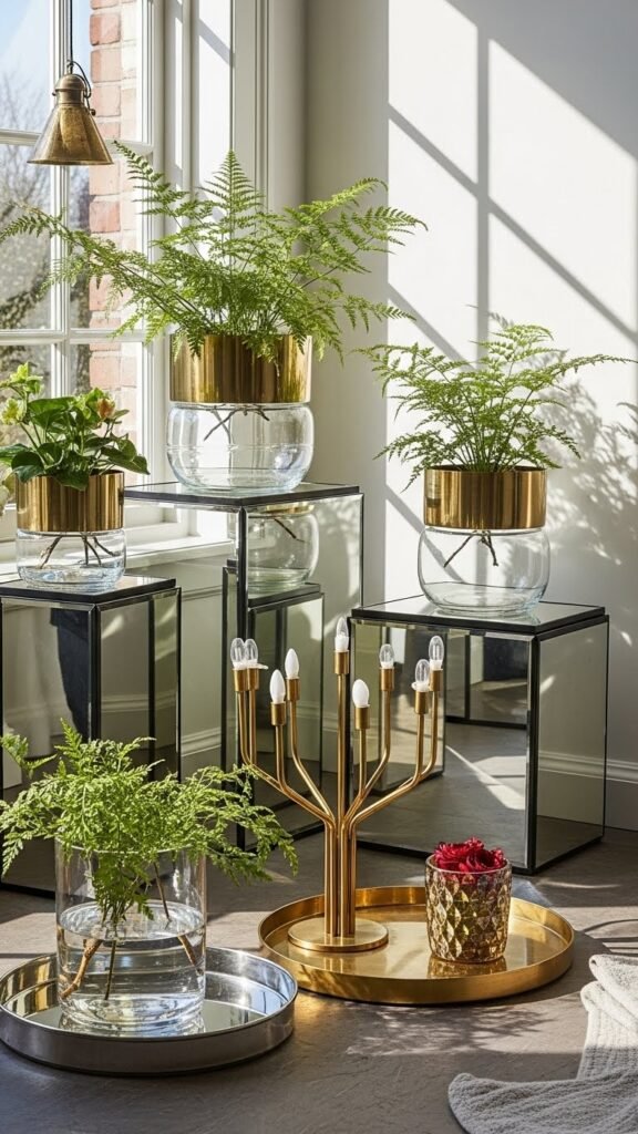 You’ll choose reflective geometric shapes to amplify brightness and create depth, pairing clear glass pots with a brass centerpiece for warmth. Place trays near windows or lamps, rotate pieces seasonally, and let reflections expand your sense of space and freedom.