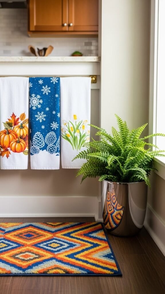 After brightening corners with reflective planters and trays, shift your attention smaller but no less impactful accents: doormats, kitchen towels and other textiles that guests touch first.