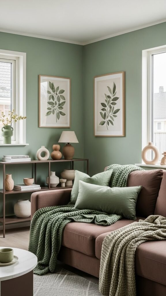 You’ll layer matcha textiles for depth, place mocha anchors like a sofa and shelving, hang botanical artwork to breathe life, and add tactile ceramics for touch.