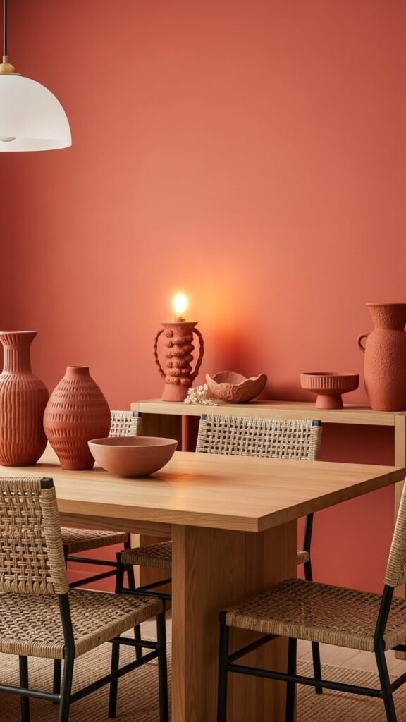 When you paint an accent wall in earthy coral, it warms the room without demanding attention, setting a convivial tone that lets a natural wood table shine.