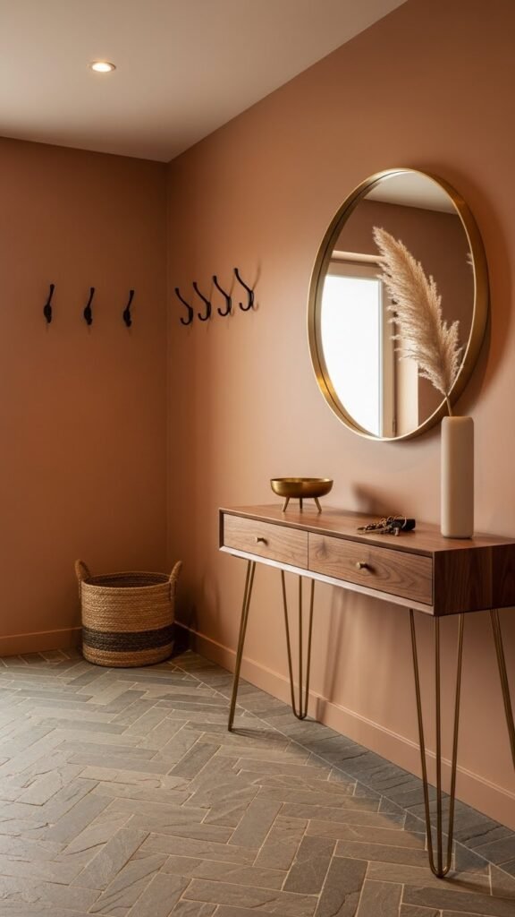 If the earthy coral dining area set a warm, convivial stage, the entryway can amplify that welcome by embracing cinnamon slate and brass hardware for a slightly more grounded, polished feel.