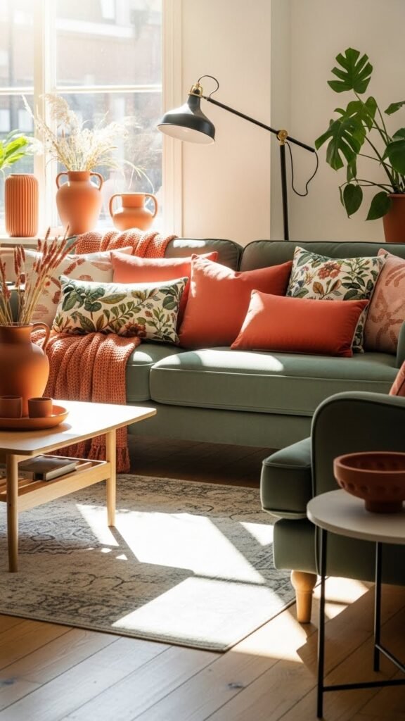 Anchor your living room with a deep sage sofa and let vibrant coral throw pillows bring the punchy contrast that modern spring palettes crave.