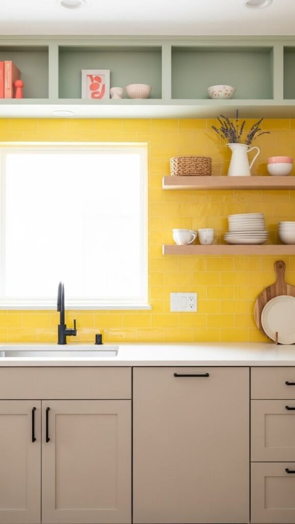Carry the fresh energy from that sage-and-coral scheme into the kitchen by pairing a limoncello-yellow backsplash with light sand cabinets—this combo feels bright without being saccharine. You’ll love how citrus grout outlines tiles, adding playful definition, while matte hardware keeps the look grounded and modern. Choose open shelving and breezy accents so the space breathes, inviting effortless, liberated living.