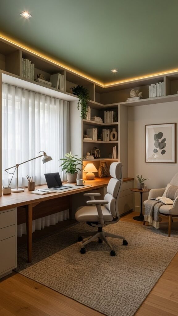 Where the nursery leaned on dusty rose and soft matcha to feel cozy and adaptable, you can flip that balance in a study by painting the ceiling a mellow matcha green so the room feels wrapped and focused without losing light.