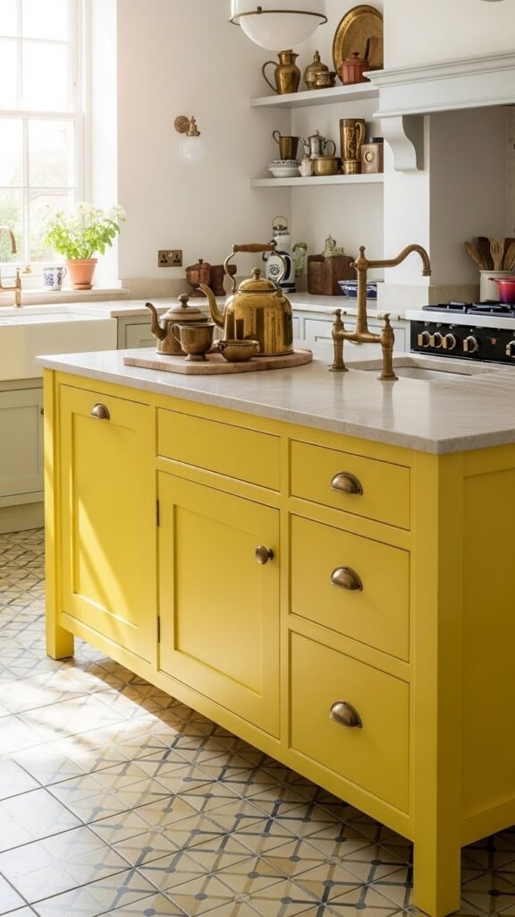 Often the kitchen island becomes the room’s signature, and a buttery yellow one paired with aged bronze fixtures gives you an instantly modern, sunlit focal point that still feels grounded.