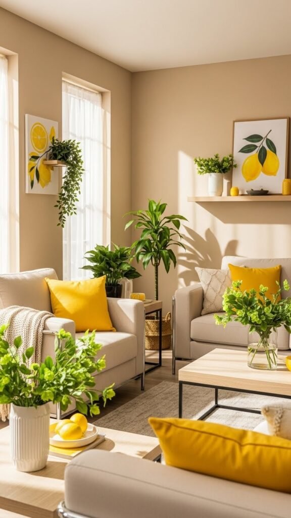 When you layer warm beige as the room’s neutral base and punctuate it with lemon and green accents, you get a modern, sunlit living area that feels both cozy and energized.