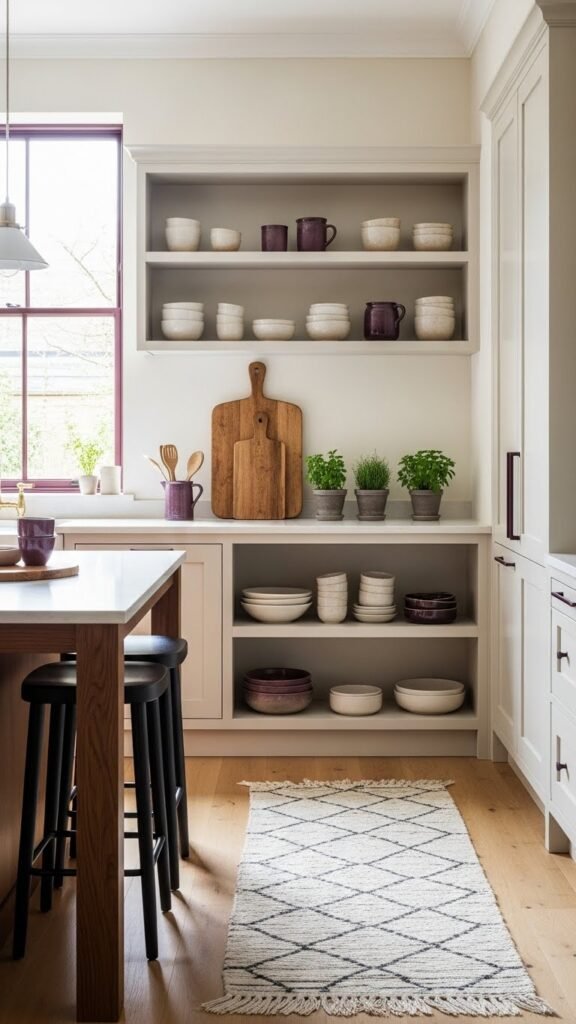 If you want a fresh, modern contrast, pair creamy walls with deep aubergine hardware and open shelving to create a chic, layered look that reads both warm and sophisticated.