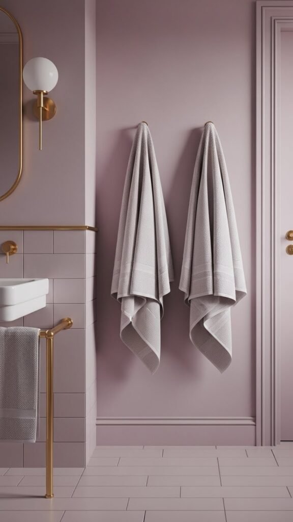 Warm Lavender Bathroom With Bouclé Towels and Brass Trim