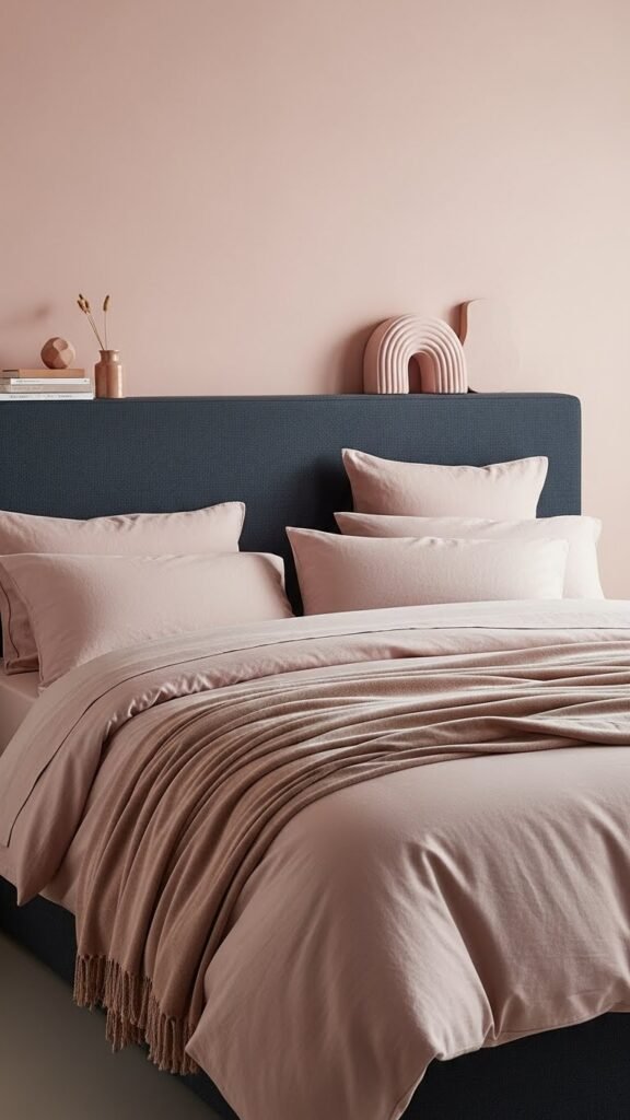Draped against a cinnamon-slate headboard, tissue-pink bedding softens the room while keeping the look modern and grounded.